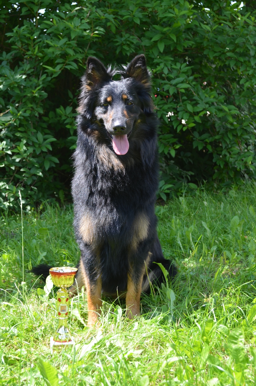 22.04.2013 19:15Na svod jsme se vydali společně se smečkou Péčkovic, jsou to naši ůžasní kamarádi ze Zlína- Redy ,Kery a dvounohé zastoupení Zuzka a Lenka. V sobotu jsme se vydali do Zlína na vycházku s pár choďákama a v neděli jsme jeli společně na svod do Štěpánova. Bylo tam plno krásných černých bafoňů jako jsem já. Rapi to vše taky okoukl a byla to pro něj parádní socializace. Ráno byla pěkná zima,ale během dopoledne se nám udělalo teplo a vysvítlo sluníčko,takže mě i paničce bylo pěkné vedro. Konečně jsem šel na řadu,napřeď mě změřili a nameřili 56cm,což si panička nemyslela,že jsem tak vysoký,potom jsem ukázal zuby,svoje nářadí,jestli jsem fakt kluk a pak jsem se šel proběhnout a chvilku si postát,aby mě mohli posoudit. Odešel jsem s moc pěkným kodem a to : A3,B3,C1,K2,W2 , což znamená +1 cm , celkový vzhled jemnější, hlava uzká, barva očí středně hnedá a pigment znaků středně sytý.